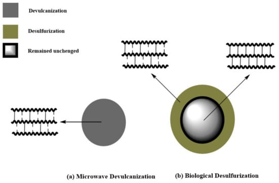 There is a kind of recycling called devulcanization: cleaving crosslinked rubber chain bonds []. The process by which rubber waste is converted into its primary uncured form through the selective scission of covalent crosslinks within the elastomer matrix is called devulcanization. Ideally, the yield of devulcanization would be a mixture of uncured rubber prepared to be vulcanized with intact polymer chains. Nonetheless, devulcanization is practically concurrent with unwanted side reactions, e.g., oxidation and chain degradation, which weaken the mechanical characteristics of the obtained devulcanized rubber. In addition, the type of curatives significantly affects rubber devulcanization. Given that the bond energies of S–S and C–S bonds are lower than that of C–C covalent bonds, peroxide-cured rubbers are more inclined to participate in side reactions (that is, degradation) in the course of devulcanization compared to sulfur-cured rubbers. Even though the reactions taking place in the course of devulcanization are not clearly understood, the generally accepted main pathways include radical formation, substitution, oxidation, and rearrangement. Even though devulcanization promoting chemicals may lead to triggering of further mechanisms, the application of the devulcanizates is limited by them []. Apart from the long history behind devulcanization, particularly over the past ten years, this procedure has gained far more attention from researchers since public concerns have arisen about waste rubber management []. In recent years, various rubber recycling techniques have been documented in scientific literature, with a significant focus on mechanical methods (32%), thermo–chemo–mechanical approaches (6%), ultrasonic techniques (4%), chemical methods (19.2%), microwave processes (25.8%), cryogenic methods (1.2%), microbial strategies (2.7%), and integrated thermo–chemo-mechanical and microwave approaches (9.9%), highlighting the use of sustainable technologies and methods []. This paper focuses on microwave and biological devulcanization to compare these methods in the technical literature to shed light on the advantages and disadvantages of these procedures.