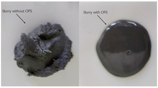 Furthermore, contact angle tests were performed for various interfaces in the slurry system, and the results are shown in Figure 7 and Figure 8. A smaller contact angle means better wettability at the interface between the solid phase and the liquid droplet. The surface interface is a high-energy region of the object, and its presence is related to surface tension. Surface tension is the tension formed at the surface of a liquid when the cohesive force of the molecules on the surface is greater than the intermolecular gravitational force. Larger surface tension is not favorable for wetting, which is manifested in the slurry by the inability of the solid phase particles to be uniformly dispersed and to form an effective envelope with the liquid, thereby increasing the internal resistance and impeding the flow of the slurry, thereby increasing the viscosity [27]. Therefore, the contact angle is also a measure and an important indicator of rheology, especially rheological properties associated with solid–liquid interfaces. When the contact angle is greater than 90°, the droplets are not wetted to the contact surface, at which point the surface tension is higher and the rheological properties can be severely limited. The contact angle test showed that the addition of OPS decreased the contact angle of the slurry on the Al surface from about 97° to about 30°, and the interface was changed from unwetted to wetted; while the addition of OPS to the slurry had little effect on the contact angle of AP, given that OPS has strong surface activity, the interfacial contact angle between AP and the slurry was reduced only by about 3°, and AP and the slurry were still unwetted after the addition of OPS, which indicated that the addition of OPS did not significantly improve the interfacial properties between AP and the liquid phase. Accordingly, it can be judged that OPS improves the rheological properties of the slurry by improving the interfacial wetting between the liquid system and Al. The results of the contact angle tests are shown in Table 2.