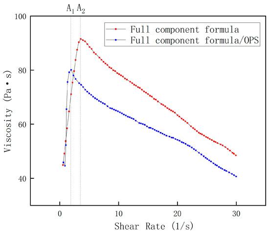 The shear rate available during the actual processing of the propellant slurry is about 1–15 s−1. In order to ensure that the rheological curves present a complete characterization of the pseudoplastic fluid with high solid content, a shear rate range of 0–30 s−1 was selected for the rheological testing of the blank formulation slurry and the 0.1% OPS slurry, and the resulting viscosity–shear rate curves are shown in the following figure.