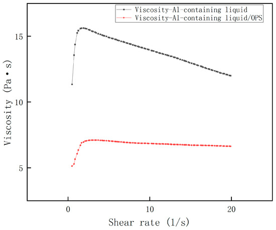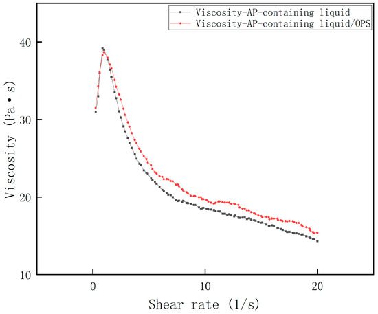 The shear rate–viscosity curves of Al-containing and AP-containing fluids were measured, and the results are shown in Figure 3 and Figure 4. It can be seen that all the rheological profiles of the slurries satisfy the rheological characteristics of the polymer fluids mentioned above, and all of them reach the maximum viscosity at a shear rate close to 1 s−1, followed by a significant decrease. Obviously, the viscosity of the Al-containing fluid decreased dramatically after the addition of OPS, and the decrease was often more than 50%; while the viscosity of the AP-containing fluid did not change much after the addition of OPS, and even showed an increase of about 7% in the range of the curve after crossing the peak value. From this, it can be initially judged that the viscosity reduction effect of OPS on the blank formulation slurry is mainly accomplished by regulating the interfacial properties of Al and the liquid system.