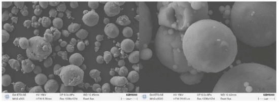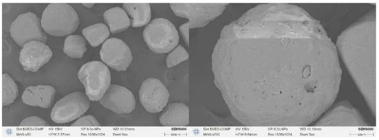 AP forms white crystals with a density of 1.94 g/cm3; Al forms gray crystals with a density of 2.70 g/cm3. The surface morphology of class III AP and 29 μm Al used in this study is shown in Figure 5 and Figure 6, and it is obvious that Al has a higher degree of sphericity. It is generally accepted that the sphericity of micron-sized aluminum powders can be up to 0.98 or more, which can be approximated as spherical, while the AP sphericity is relatively low [23,24,25]. The Al powder and AP sphericity chosen for the experiment were 0.95 and 0.53, respectively. The different surface morphologies of the two solid-phase particles may lead to different coating effects of the binder system on the particles. At the microscopic level, the dispersibility of the 29 μm aluminum powder selected for the experiment was slightly poor, with a small range of local agglomerations, and the effect of viscosity reduction was more obvious after surfactant dispersion. Strong surface adsorption and self-agglomeration existed between the experimentally selected 29 μm Al particles, and the internal friction between the particles after mixing with HTPB to form a suspension was also more obvious [26]. Under the premise that the particle size of class III AP is larger than 29 μm Al, the viscosity of the AP-containing liquid is still significantly higher than that of the Al-containing liquid, which is attributed to the high sphericity of Al, which can form a better coating with HTPB/DOS in the case of a blank formulation.