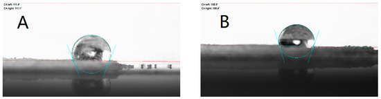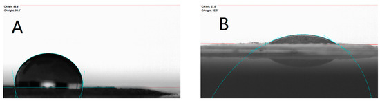 Contact angle of slurry in AP. (A) AP-containing liquid; (B) AP-containing liquid/OPS.