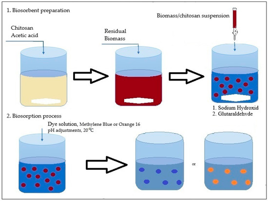 In this study, two types of biosorbents were used: based on chitosan (CB) and based on spent biomass immobilized in a chitosan matrix (SpCB) (Figure 1) using a simple dripping technique following previously detailed procedures [39] and systematized in Figure 2.