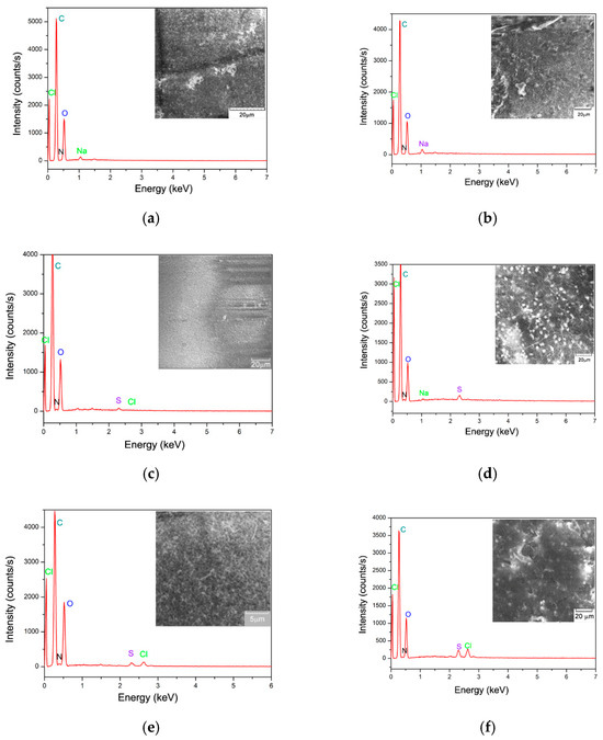 The EDAX spectra of the characterized samples revealed the presence of various elements on the surface, originating from both microbial biomass and chitosan (Figure 4a). Also, the EDX results validate the retention of dyes by the appearance of some chemical elements characteristic of them (such as the presence of Cl− or S2−).