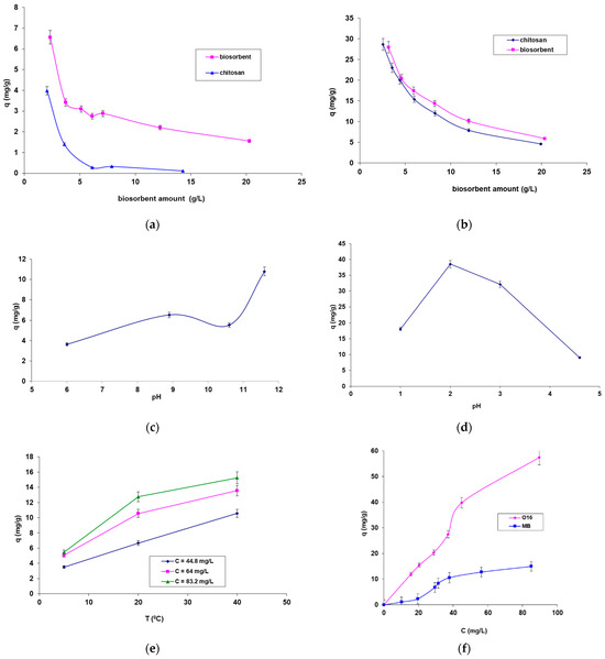 Factors influencing the biosorption of the dyes onto SpCB and CB. The influence of biosorbent dose in the case of biosorbtion of MB (a) and O16 (b) dye; The influence of pH in the case of MB (c) and O16 (d); The influence of temperature in the case of MB dye biosorbtion onto biosorbent based on biomass immobilized in chitosan matrix (e); The influence of initial concentration of the dyes solution (f).