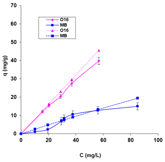 - It is observed that for SpCB, the maximum biosorption capacity for the reactive dye O16 (285.71 mg/g) is significantly higher than for the cationic dye MB (212.77 mg/g). These findings support previous results that the higher biosorption capacity for O16 is due to a stronger affinity between the functional groups of the anionic dye molecule (SO32−) and the functional groups on the surface of the biosorbent, derived from both the chitosan matrix and the immobilized microbial biomass.