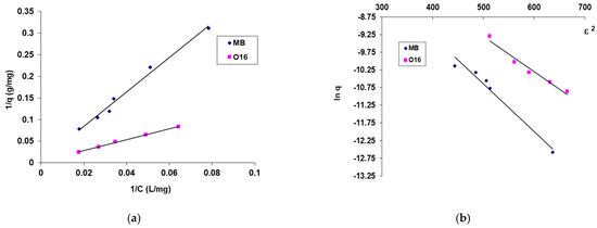 Linearized form of Langmuir (a) and DR (b) plots for the MB and O16 dye on SpCB. Conditions: (MB) pH = 11.6, contact time = 20 h, biosorbent amount: 2.4 g/L, 20 °C; (O16) pH = 2, contact time = 20 h, biosorbent amount: 2.4 g/L, 20 °C.