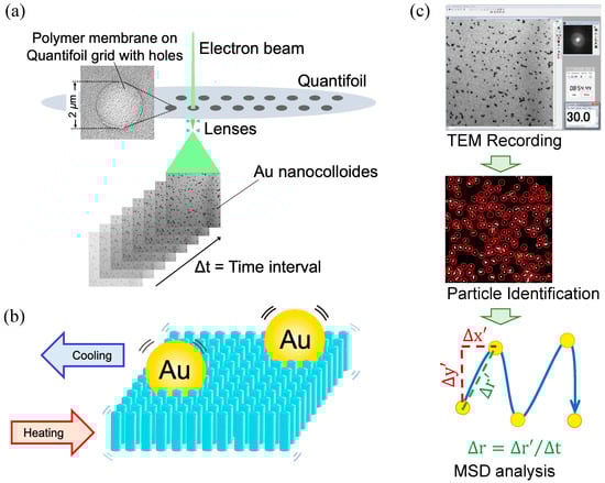 Measurement of molecular dynamics improves understanding of the structure–function relationships of materials including polymers and proteins [1,2]. Various techniques such as optical microscopy, high-speed atomic force microscopy, X-ray free electron laser, and electron microscopy have been used for this purpose [3,4,5,6,7,8,9,10,11,12,13,14,15,16]. Recent advances in electron microscopy have enabled the observation of chemical and physical processes directly in situ with high spatial and temporal resolution [17,18,19]. Using micro-sample installation devices such as MEMS chips and environmental cells composed of SiNx, graphene chambers, or carbon sandwiches, extensive research is being conducted. Examples include the study of chemical reactions, crystal formation, and other phenomena in liquid or gas environments, under various physical stimuli such as electric, thermal, and mechanical control [20,21,22,23,24,25]. Additionally, distinctive applications of single-particle analysis using cryo-electron microscopy, such as time-resolved studies of molecular conformation changes to elucidate protein dynamics, have been actively pursued [26,27,28,29]. Furthermore, high-resolution electron microscopy techniques have visualized the movements of molecules, including perfluoroalkyl chains and antibiotics, at the atomic level [30,31,32]. Ultrafast electron microscopy is another state-of-the-art technique capable of examining objects at femtosecond and angstrom scales [33,34]. These technical advancements underscore that transmission electron microscopy (TEM) is one of the most powerful tools for molecular dynamics research, with growing demand expected across many fields of modern science and engineering.