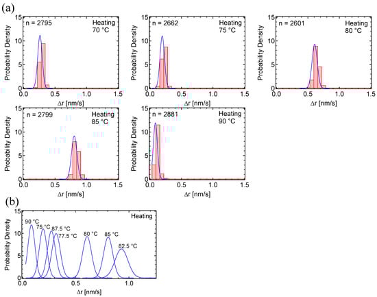 We analyzed the PD histograms of the motion component Δr’ = (Δx’2 + Δy’2)1/2, where x’ is the horizontal and y’ is the vertical movement of each gold nanoparticle in the TEM images. Motion histograms during the heating process, taken at 5 °C intervals between 70–90 °C (Figure 3a), and the overlay of the fitting curves (Figure 3b) demonstrate that the motion increased between 77.5–87.5 °C. The motion histograms at this temperature range were well-fitted by single curves. The maximum motion dynamics was calculated as 0.92 nm/s at 82.5 °C.