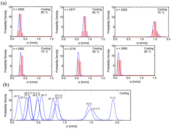 Motion histograms during the cooling process, taken at 5 °C intervals from 85 °C to 60 °C (Figure 4a), and the overlay of their curve fittings (Figure 4b), show that the motion increased between 67.5 °C and 72.5 °C. The motion histograms in this temperature range were also well-fitted by single curves. The maximum motion dynamics of 1.9 nm/s at 71 °C (Figure 4b) was almost double the 0.92 nm/s observed during the heating process (Figure 3b). Since the crystallization process occurs rapidly within a narrow temperature range, it is reasonable to observe more rapid peak dynamics in the cooling process, which may be significantly high.