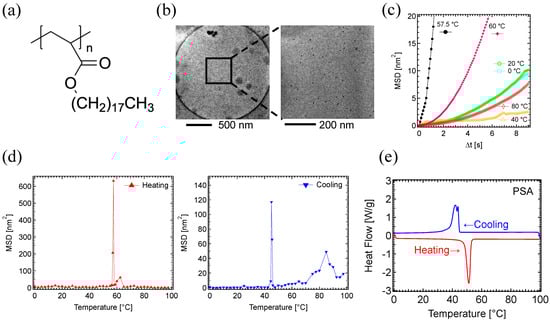 TEM-based motion analysis of PSA in heating/cooling cycle: (a) Chemical structure of PSA. (b) TEM image of gold nanoparticles on the PSA membrane. (c) MSD curves of PSA in heating process. (d) MSD of (left) heating process from 0 to 98 °C, and (right) cooling process from 98 to 0 °C. MSDs at specific time intervals of 8 s (Δt = 8 s) were analyzed. (e) DSC results of PSA.