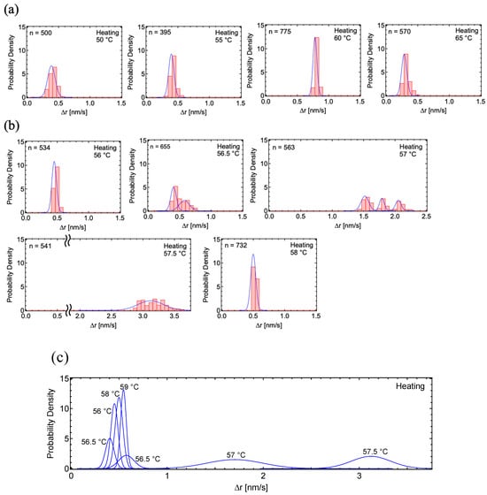 Probability density histograms of PSA in heating cycles: (a) PD histograms of PSA under the heating process, taken at 5 °C intervals between 50–65 °C. (b) Detailed PD histograms of PSA under the heating process, taken at 0.5 °C intervals between 56–58 °C. (c) Overlay of fitting curves for the PSA heating process. In the figures, ‘n’ represents the total number of displacements.