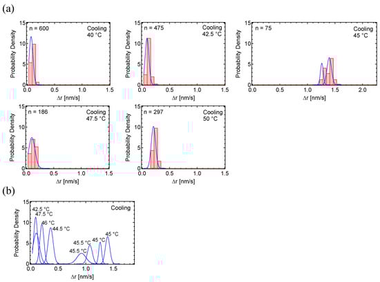 Motion histograms during the cooling process, taken at 2.5 °C intervals from 50 °C to 40 °C (Figure 7a), and the overlay of their fitting curves (Figure 7b), show that the motion increased between 42.5 °C and 47.5 °C. The motion in the transition state at 45 °C was fit by two Gaussian curves, while the PD of other temperatures were well-fitted by single curves. The maximum motion dynamics of 1.4 nm/s at 45 °C (Figure 7b) was lower than the 3.1 nm/s observed during the heating process (Figure 6c). A broad MSD peak was observed for PSA between 70 °C and 90 °C in the cooling process (Figure 5d, right). This may partly explain the lower MSD value of PSA at the crystallization point.