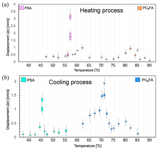 The MSD of the heating process, measured at 0.5 °C intervals, showed a significant increase in MSD between 75 °C and 85 °C (Figure 2d, upper). Considering the reported melting temperature of PC8FA (70–75 °C), this large MSD peak reflects molecular motion associated with structural remodeling in melting. The MSD peak consisted of at least three distinct sub-peaks at 79.5 °C, 82.5 °C, and 84.5 °C, with the highest peak at 82.5 °C.
