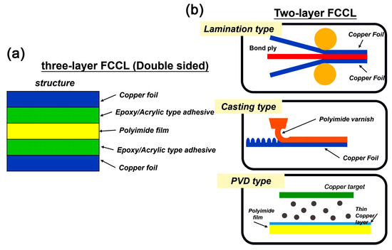 Comparison of the typical structures of the three-layer (a) and two-layer FCCLs (b).