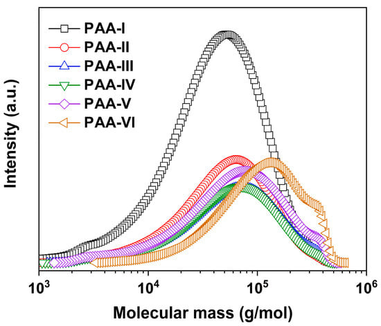 First, the PAA precursors were synthesized and the molecular mass values were detected by GPC measurements, whose data and plots are shown in Table 2 and Figure 3, respectively. All the copolymers showed high molecular mass values over 104 g/mol and polydispersity indices (PDI) in the range of 2.00 to 2.63, indicting the good polymerization reactivity of the four monomers and fewer side reactions in the polycondensation. In addition, the molecular mass, either the number average (Mn) or the weight average (Mw) ones, of the PAAs gradually increased with the increasing molar contents of NDA in the diamine units (Figure 3). For example, PAA-I showed an Mn value of 2.37 × 104 g/mol, which was apparently lower than that of PEsI-VI (Mn = 6.70 × 104 g/mol). This might be due to the relatively higher reactivity of NDA compared with ABABP. For the latter, the electron-withdrawing ester linkages and the bulky phenyl substituents in the molecular structures deteriorated the reactivity of the amino groups based on either the electronic effects or the steric hindrance effects. Nevertheless, the current PAA precursors were successfully cast into tough PEsI films. The rigid-rod biphenyl and ester linkages in the dianhydride units and the main-chain ester bonds and the lateral phenyl substituents in the diamine units endowed the PEsI films with good tensile properties, with a tensile strength (TS) over 148 MPa and a tensile modulus (TM) over 5.1 GPa. The good tensile feature was beneficial for the practical applications of the current PEsI specimens in the two-layer FCCLs.
