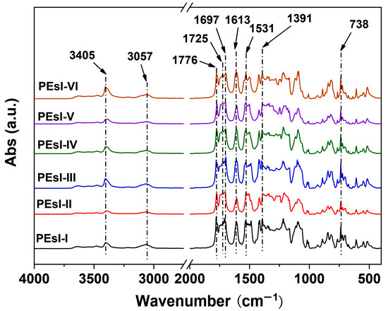 Figure 4 depicts the FTIR test results of the PEsI specimens, in which the characteristic absorptions of the composition structures in the polymers could be clearly identified. For example, the imide rings revealed the characteristic absorptions at 1776 cm−1 (asymmetric carbonyl stretching vibrations), 1725 cm−1 (symmetric carbonyl stretching vibrations), 1391 cm−1 (C-N stretching vibrations), and 738 cm−1 (carbonyl bending vibrations), respectively. The ester carbonyl groups exhibited the characteristic absorptions at 1697 cm−1. The secondary amine (-NH-) groups in the NDA units and the unsaturated C-H bonds in the phenyl units showed the characteristic absorptions at 3405 cm−1 and 3057 cm−1, respectively. At last, the unsaturated -C=C- bonds in phenyl rings showed the characteristic absorptions at 1613 cm−1 and 1531 cm−1, respectively. The FTIR results indicated the obtaining of the polymers.