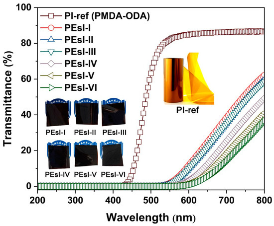 Figure 6 depicts the UV-Vis spectra of the PEsI films and the referenced PI-ref film based on pyromellitic dianhydride (PMDA) and 4,4′-oxydianiline (ODA), together with the appearance of the samples. The optical data of the films are tabulated in Table 3. Visually, the PEsI samples all presented black appearance, while the PI-ref sample showed the standard brown–yellow color. Quantitatively, the PEsI films showed a cutoff wavelength (λcut) over 500 nm, which was nearly 100 nm higher than that of the standard PI-ref sample (λcut = 407 nm). The PEsI samples exhibited the totally opaque feature at the wavelength of 500 nm (T500 = 0) and exhibited optical transmittance values that decreased from 54.0% (PEsI-I) to 27.4% (PEsI-VI) at the wavelength of 760 nm with the increasing contents of NDA in the polymers. Comparatively, the PI-ref showed T500 and T760 values of 63.2% and 86.3%, respectively.