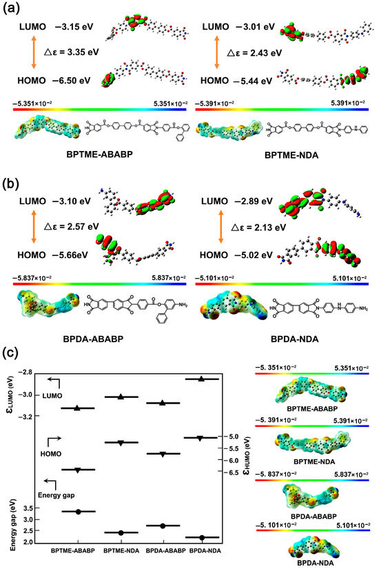 Frontier orbit simulation results for the PEsI specimens. (a) BPTME-derived PEsIs; (b) BPDA-derived PEsIs; (c) orbit energy and energy gap of PEsIs.