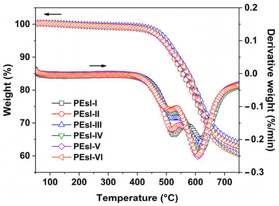 Thermal resistance of the black PEsI films were investigated by various measurements and the thermal data are summarized in Table 4. First, Figure 8 depicts the TGA as well as the corresponding derivative TG (DTG) curves of the PEsI samples. All the samples maintained most of the original weights before 400 °C; after that, obvious decompositions were observed. The 5% weight loss temperatures (T5%) were found to be from 488 °C to 503 °C. The dual decomposition phenomena were clearly recorded in the DTG curves. The temperatures corresponding to the first rapidest decomposition (Tmax1) and the second rapidest decomposition (Tmax2) were detected in the range of 510–525 °C and 607–620 °C, respectively. The first decomposition might be attributed to the decomposition of the ester linkages in the polymers, while the second one was mainly due to the decomposition of the residual polymer skeletons. At 750 °C, the polymers left about 60 wt% of their original weights, reflecting the good thermal resistance of the samples.