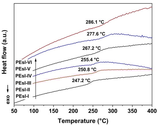 The glass transition temperatures (Tg) of the PEsI samples were gained by DSC and DMA measurements and the obtained Tg values were termed as “Tg, DSC” and “Tg, DMA”, respectively. Figure 9 presents the DSC plots of the PEsI samples. No obvious melting peaks were observed for all the polymers, although slight crystallinity was detected in the XRD plots (Figure 5). Obvious glass transitions were observed in the tests and the Tg, DSC values increased from 247.2 °C for PEsI-I to 286.1 °C for PEsI-VI. The moderate levels of Tg, DSC values were beneficial for the hot-pressing procedures in the formation of two-layer FCCLs.