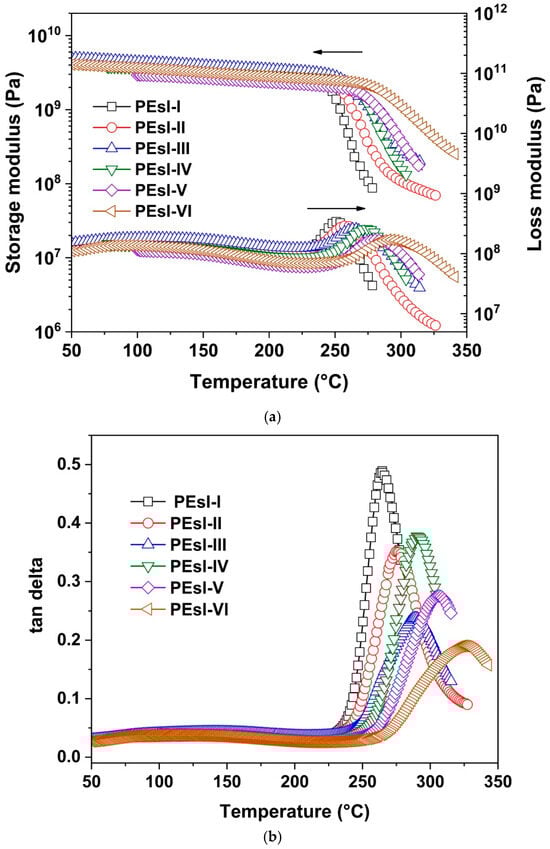 Storage and loss modulus (a) and tan delta (b) of PEsI samples in DMA tests.