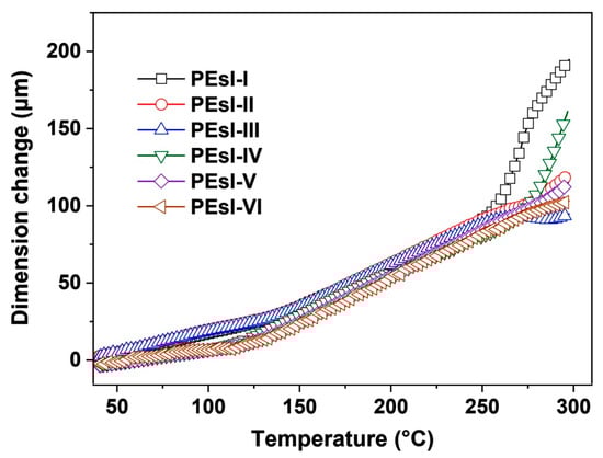 The thermal endurance of the developed PEsI samples at elevated temperatures was investigated by TMA tests. Figure 11 presents the TMA curves of the PEsI samples and the CTE data are tabulated in Table 4. Incorporation of NDA components in the diamine units slightly deteriorated the thermal endurance of the polymers. The PEsI sample derived from BPTME, BPDA, and ABABP showed a CTE value of 15.3 × 10−6/K [29], while the data increased to (27.1–33.4) × 10−6/K for the current polymers. The CTE values were a bit higher than that of the copper foil (~17.0 × 10−6/K). This might be due to the flexible imino (–NH–) bridges in the NDA components. Although the thermal endurance of the PEsI samples was slightly deteriorated, they still showed acceptable CTE values for practical two-layer FCCL fabrications.