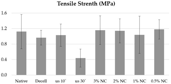 At the stage of preparation for the study, a number of tests were conducted, showing that simple incubation of decellularized tissues in solutions with a Novochizol™ concentration of 0.5 to 3% on an orbital shaker for 1 h has no effect on the strength properties of the tissues. Similarly, ultrasonic treatment of samples in an isotonic solution leads only to a decrease in specific strength (Figure 1).
