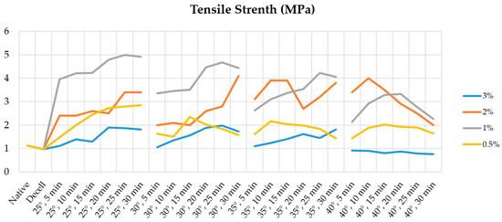 Our data analysis shows that when the processing temperature is increased above 35 °C, the specific strength decreases regardless of the Novochizol™ concentration and processing time to minimum values of 0.76 ± 0.14 MPa when treated with 3% Novochizol™ for 30 min at 40 °C, 2.01 ± 1.25 MPa when treated with 2% Novochizol™ for 30 min at 40 °C, 2.26 ± 1.69 MPa when treated with 1% Novochizol™ for 30 min at 40 °C, and 1.65 ± 0.76 MPa when treated with 0.5% Novochizol™ for 30 min at 40 °C. Statistical analysis of the differences in specific strength of aortic samples only for a processing time of 30 min showed a significant difference both with the native material and with the decellularized one.