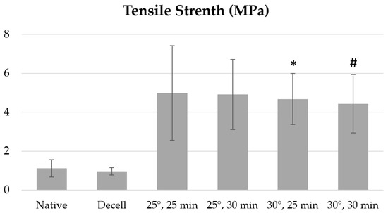 The temperature conditions also had a significant impact on the specific strength of decellularized fragments of the porcine aortic wall (Figure 3).