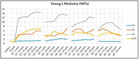 The Young’s modulus of the decellularized fragments of the porcine aortic wall increases from 0.73 ± 0.06 MPa to an absolute maximum of 14.66 ± 7.14 MPa when treated with 1% Novochizol™ for 25 min at 25 °C (Figure 4).