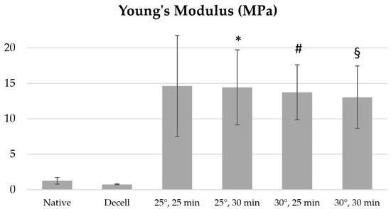 Young’s modulus values of aortic samples treated with 1% Novochizol™ solution relative to intact materials: * p = 0.039 vs. Native; # p = 0.0158 vs. Native; § p = 0.0306 vs. Native; Native—native materials, Decell—decellularized materials.