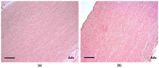 Histological structure of the porcine aortic wall before (a) and after (b) decellularization: hematoxylin–eosin staining, scale bar 200 μm. Adv—adventitial surface of the aorta.