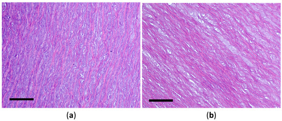 Histological structure of the porcine aortic wall after treatment with Novochizol™ (1% solution, 30 min) at a temperature of 25 °C (a) and 40 °C (b): hematoxylin–eosin staining, scale bar 100 μm.