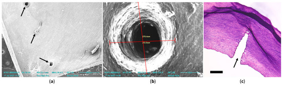 Evaluation of the size and ultrastructure of laser channels in decellularized and chitosan-treated aorta: (a) General view (SEM micrograph, arrows indicate channels made every 2 mm; the entrance of one channel is closed with tissue debris); (b) micrometry of the channel entrance on SEM micrograph (276 × 253 μm); (c) micrograph of the aorta after laser tunneling, transverse cryo-section; the arrow indicates the direction of laser exposure, duration 40 ms; hematoxylin–eosin staining, scale bar 500 μm.