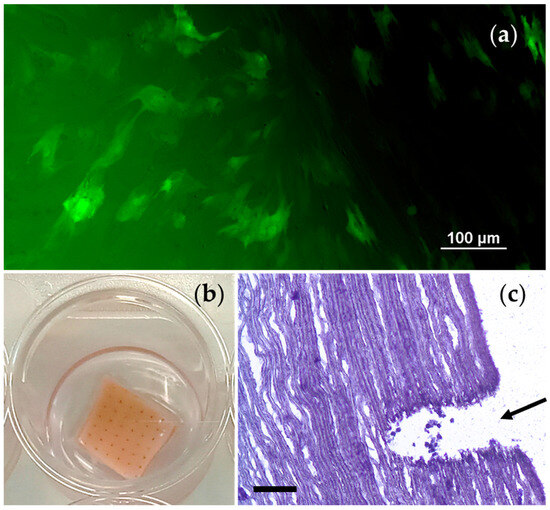 Seeding of decellularized and chitosan-treated porcine aortic samples under static in vitro conditions, observation for 7 days: (a) Viable GFP-labeled VICs on the surface of the treated aortic sample (scale bar 100 μm); (b) general view of the sample with applied VICs in a 24-well plate; (c) presence of VICs inside the laser channel (indicated by an arrow, 10 μm cryo-section, hematoxylin–eosin staining, scale bar 100 μm).
