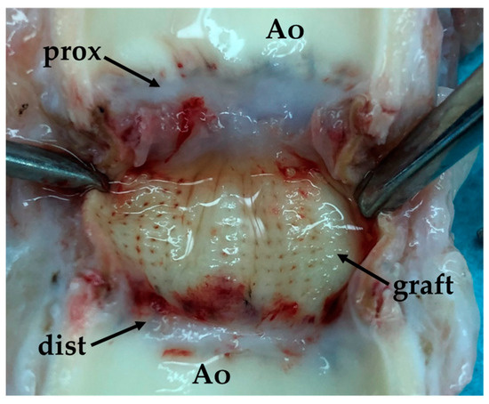 Macroscopic preparation of the developed vascular prosthesis, opened by a longitudinal incision through both anastomoses: Ao—tissues of the recipient aorta; graft—material of the implanted vascular graft; prox—proximal anastomosis; dist—distal anastomosis.