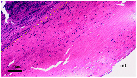 Cellular migration into the stroma of the vascular prosthesis: hematoxylin–eosin staining, scale bar 100 μm. Yellow dotted line—the boundary of the implanted vascular graft and the newly formed adventitial tissue; int—intimal side of the vascular graft.