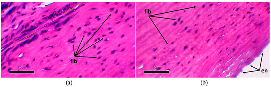 Migration of cellular elements into the acellular stroma of the vascular graft: hematoxylin–eosin staining, scale bar 50 μm. (a) Adventitial side of the vascular graft; (b) intimal side of the graft; yellow dotted line—the boundary of the implanted vascular graft and the newly formed adventitial tissue; fib—clusters of fibroblast-like cells; en—single endothelial cells.