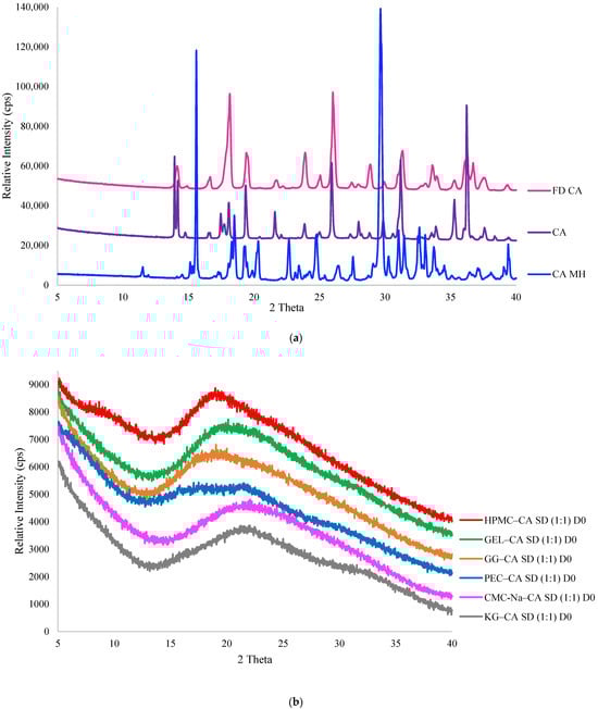 The presence of amorphous ingredients, such as hydrocolloids, in a formulation may create conditions favorable for amorphization of a co-formulated crystalline ingredient during processing (e.g., lyophilization or spray-drying), often by elevating the Tg of the system compared to the Tg of the target compound alone and/or by stabilizing the amorphous form via favorable intermolecular interactions that inhibit crystallization [34,35]. Amorphization will not occur spontaneously by simply blending amorphous polymers with crystalline ingredients when the process does not disrupt the initial crystal matrix. The ratio of ingredients in a formulation influences the resulting form and stability of the product. The amount of polymer needed to produce amorphous solid dispersions of CA varied among the polymers studied. Less PEC or CMC-Na (20% w/w) was needed to amorphize CA than GEL, GG, or HPMC (30% w/w) (Figure S1a–f). KG was the polymer that required the highest amount (40%) to yield amorphous CA in the solid dispersion (Figure S1f). When CA crystallized in the polymer dispersions during lyophilization, its PXRD pattern was that of the anhydrous crystalline form.