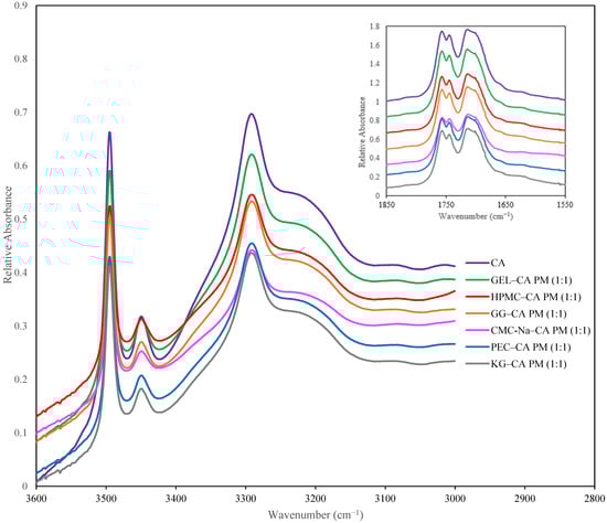 Figure 3. Mid infrared spectra of 1:1 Citric Acid (CA)–Polymer physical mixtures (PMs).