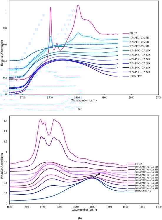 When polymers were simply blended with CA at a 1:1 ratio, the IR spectra of the physical mixtures resembled that of CA in terms of peak shapes and positions, as shown in Figure 3, documenting the lack of interaction between CA and the polymers. This was not the case for the lyophilized CA–polymer solid dispersions (Figure 4, Figures S3 and S4). Changes in peak locations and/or shapes in the IR spectra of the solid dispersions were found, when compared to the spectra of both the individual polymers and the FD CA and were highly associated with the polymer to CA ratio. We start by first considering the spectra of the polymers (Figure 4, Figures S3 and S4). A broad single band, which non-crystalline polymers tend to contain [40], was found in the hydroxyl regions of the IR spectra of the polymers, with maximum absorbance detected at 3400 cm−1, 3419 cm−1, 3322 cm−1, 3461 cm−1, 3388 cm−1, and 3422 cm−1 for CMC-Na, PEC, GEL, HPMC, GG, and KG, respectively (Figure 4a and Figure S3a–c). In addition, peaks in the carbonyl region occurred at 1600 cm−1 for CMC-Na, 1653 cm−1 and 1558 cm−1 for GEL, and 1743 cm−1 and 1622 cm−1 for PEC (Figure 4b–d). It should be noted that HPMC, KG, and GG do not contain any carbonyl groups, which was reflected in their spectra (Figure S4a–c).