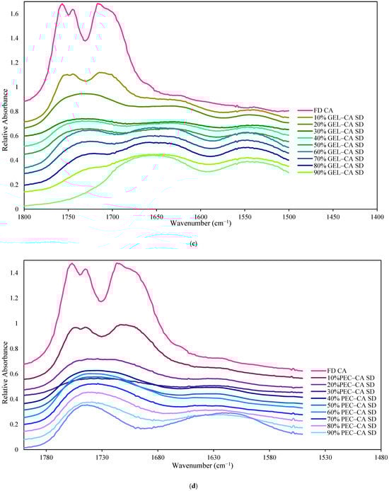 Figure 4. Mid-infrared spectra of CA–Polymer solid dispersions (SDs) made with different ratios shown as follows: (a) the NH/OH region of the CA–PEC SDs; the carbonyl stretching region of (b) CA–CMC-Na; (c) CA–GEL; and (d) CA–PEC SDs.