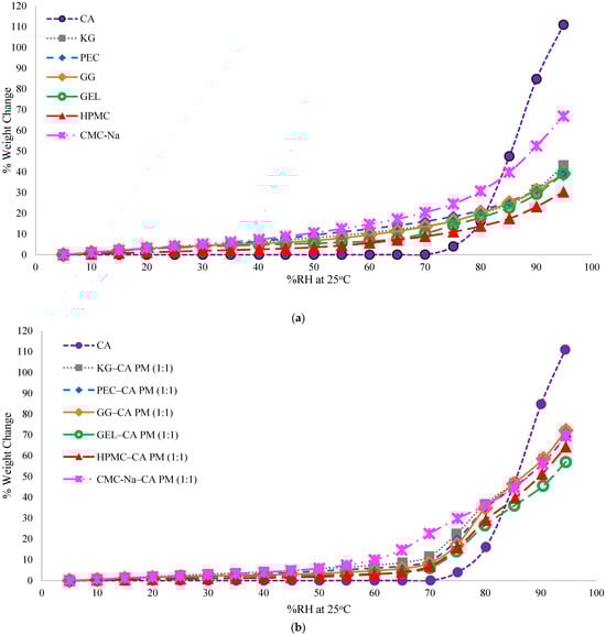 Moisture sorption profiles of the CA–polymer physical mixtures were compared to those of the solid dispersions (Figure 5b,c). The trends in relative moisture sorption exhibited by the individual polymers did not generally carry forward to the trends in the physical mixtures or dispersions. While CMC-Na was the most hygroscopic polymer and resulted in the highest moisture sorption in physical mixtures, between 60% and 80% RH, other polymer physical mixtures sorbed more water at higher RHs, and other solid dispersions sorbed more water across a wider RH range. Gelatin, not HPMC, produced the least hygroscopic physical mixtures and solid dispersions.