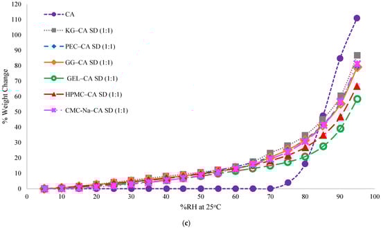 The moisture sorption profiles of individual CA and polymer ingredients, physical mixtures, and solid dispersions were collected at 25 °C (Figure 5a–c) and 40 °C (Figure S5a–c). The moisture sorption profiles of crystalline CA and FD CA were also generated (Figure S6a). Anhydrous crystalline CA has a deliquescence RH of 74–75% RH at 25 °C, and CA monohydrate has a deliquescence RH of 78% RH [21,48]. Deliquescent crystals exhibit little moisture sorption below their deliquescence RHs, limited to surface adsorption and capillary condensation [49]. Both CA and FD CA exhibited little moisture sorption below 75% RH, some moisture uptake at 75% RH, and increasing amounts of moisture sorption at higher RHs, characteristic of anhydrous crystalline CA moisture sorption patterns. The higher hygrocapacity of FD CA was attributed to the smaller particle sizes and disorder resulting from lyophilization, which could increase the rate of moisture sorption. The polymers exhibited typical type II (sigmoidal) moisture sorption patterns (Figure 5a), characteristic of amorphous materials. All polymers sorbed more moisture than CA at RHs < 80% RH. Of the polymers, CMC-Na sorbed the most moisture (had the highest hygrocapacity), and HPMC sorbed the least (Figure 5a).