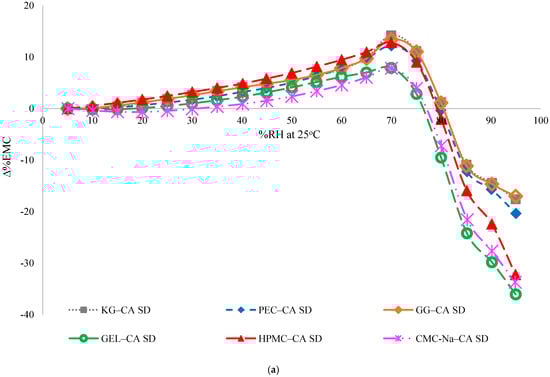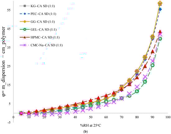 Predicted moisture sorption profiles for the solid dispersions were calculated based on an additive model in which the contribution of individual lyophilized ingredients (FD CA and polymers) for the moisture sorption is taken into account. Moisture sorption was considered to be synergistic when experimental samples sorbed more moisture than the calculated values based on the additive model. Experimental and predicted moisture sorption profiles of the solid dispersions and the difference between additive model and experimental values are shown in Figure 6a and Figure S6b–f. These differences increased as RH% increased from 0% to 70% RH, attributed to the amorphous CA sorbing more moisture than crystalline CA below the deliquescence RH. The largest differences (∆% EMC) were found in the KG–CA and HPMC–CA solid dispersions at 0–70% RH, while CMC-Na–CA solid dispersions had the smallest differences in the same conditions (Figure 6a). As RH increased above 75% RH, the trends in ∆% EMC changed, with the experimental samples sorbing less moisture than the predicted model, driven by the higher amount of water sorbed by crystalline CA above its deliquescence RH. The impact of amorphous CA on the moisture sorption of solid dispersions was investigated by calculating the φ value (using Equation (1)), which eliminates the contribution of the polymers to the amount of moisture absorbed, in order to reveal the effect of CA only (Figure 6b). Positive φ values were found for the solid dispersions, meaning that CA contributed to the moisture sorption of the solid dispersions. The differences in φ values between the dispersion types, which all contained the same amount of CA and polymer, indicate that interactions between the CA and the polymers had an influence on moisture uptake. Otherwise, all φ values would have been similar. Trends in φ values based on polymer type varied above and below 70% RH.