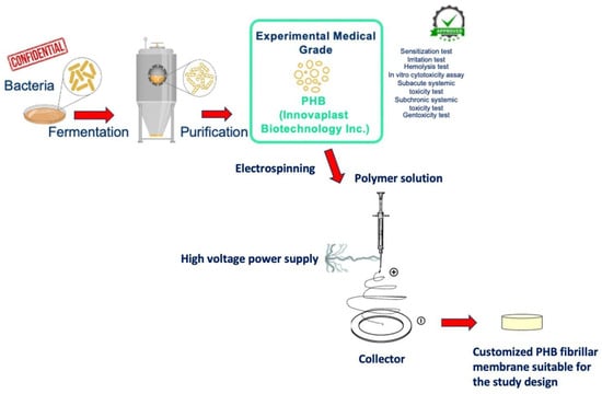 PHB was obtained from bacteria’s fermentation, with a bacterial strain that is confidential for trading reasons. After growth, the fermented bacteria were subjected to a purification process and the experimental medical-grade PHB raw material emerged. This production process had been approved with pre-use tests (sensitization test, irritation test, hemolysis test, in vitro cytotoxicity assay, subacute systemic toxicity test, subchronic systemic toxicity test, and genotoxicity test) by the cooperated producer company (Innovaplast Biotechnology Inc., Eskisehir, Turkey). The PHB membrane production process was carried out, in accordance with the study design, by the electrospinning method. The electrospinning system consists of the power source and the injector pump. An aluminum-foil-covered copper plate was used as a collector and PHB at a concentration of 8% (w/v) was dissolved in chloroform, 2-fluoroethanol (20:1 v/v) at 60°C in a heated magnetic stirrer. PHB solution was placed in the syringe pump in a 20 mL syringe; the collector was placed 10 cm away from the syringe. The syringe pump was set to a 0.3 mL/hour flow rate, the power supply was 10 kV, and PHB membranes were produced on the copper plate [19]. The disc-shaped samples suitable for the study design were cut from the produced PHB membrane. A comprehensive scheme of the production stages of PHB is illustrated in Figure 1.