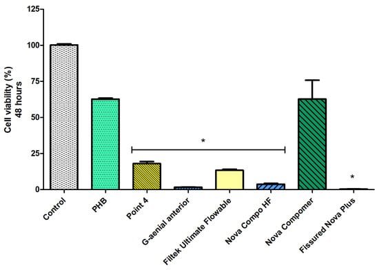 At 48 h (Figure 5), a decrease in cell viability was observed in all groups (p < 0.05). The highest cell viability rate was detected in the PHB and Nova Compomer groups (p < 0.05). There was no significant difference between the PHB, Nova Compomer, and control groups. The lowest cell viability was determined in the Point 4, G-aenial anterior, Filtek Ultimate Flowable, Nova Compo HF, and Fissured Nova Plus groups compared to the control (p < 0.0001). The cell viability rate was observed as lower than 25% in these tested RBCs at 48 h.