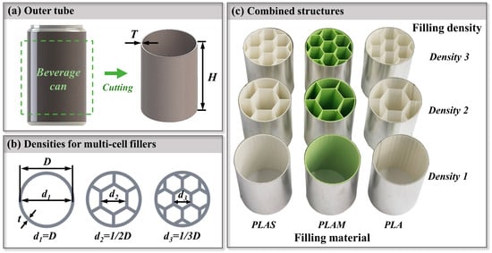 Steel beverage cans were widely utilized in beverage packaging applications. In this study, a common type of steel beverage cans was purchased from JingCheng (Shenzhen, China). As shown in Figure 1a, the repurposed beverage can had a diameter of 65 mm, a height H of 90 mm, and a thickness T of 0.2 mm. As shown in Figure 1b, the multi-cell fillers had hexagonal cells and were designed with three densities. The literature indicated that hexagonal cells tended to experience stable deformation [,]. Based on self-similar design, the geometric dimensions of sub hexagonal cells were 1, 1/2, and 1/3 of the external circle diameter, respectively. All multi-cell fillers had the same thickness t of 0.8 mm and height h of 90 mm. To integrally manufacture these multi-cell structures, a commercial 3D printer (Wiiboox, Nanjing, China) based on the FDM technique was used []. Three biodegradable green materials, polylactide (PLA), polylactide matte (PLAM), and polylactide super tough (PLAS), were selected as printing filaments. The printing temperature was 210 °C, and the printing speed was 40 mm/s. Table 1 represents the mechanical properties of the three materials provided by the supplier (eSUN, Shenzhen, China). The data showed that different materials had different strengths and fracture toughness, which would affect the energy absorption characteristics of multi-cell fillers.