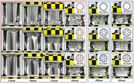 To further explore the deformation mechanisms of the structures with different filling densities, Figure 3b shows the top view of three compressed PLA-filled beverage cans. For PLA1F, it was found that the collapse mode of the filled tube was similar to the diamond mode of hollow metal circular tubes [,]. Four diamond folds were formed in one deformed layer along circumference of the tube. Then, a similar layer developed, which was rotated at a certain angle relative to its adjacent layer. These quadrilateral deformation layers overlapped each other, which presented an asymmetric diamond mode []. For PLA2F and PLA3F, the inner multi-cell tube exhibited a progressive collapse mode, while the outer circular tube exhibited an irregular diamond-like mode. The number of polygonal angles formed in folded cans was determined by the configuration of the inner multi-cell tube []. These results indicated that as the filling density increased, the influence of the inner multi-cell tubes on the overall deformation became pronounced. For PLAS-filled and PLAM-filled tubes, the failure modes were similar to those of PLA-filled tubes as the filling density changed.